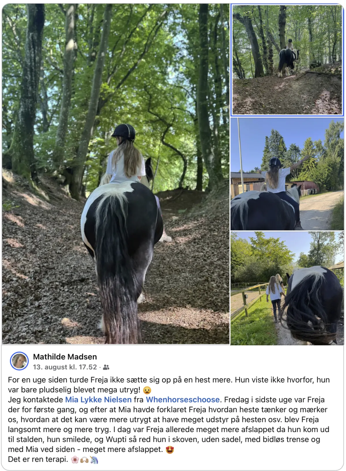 Today, Freja was already much more at ease when she arrived at the stable — she smiled, and before we knew it, she was riding in the forest, without a saddle, with a bitless bridle, and Mia by her side — much more relaxed. 😍