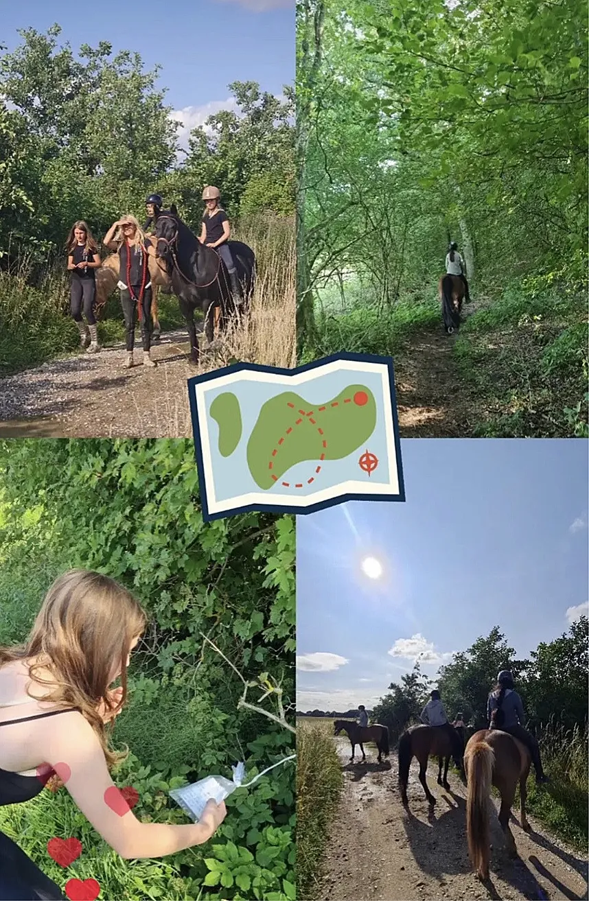 We do groundwork, ride, some also practice jumping – and there is always a treasure hunt on horseback, ridden in small teams in a nearby forest, and always bitless.